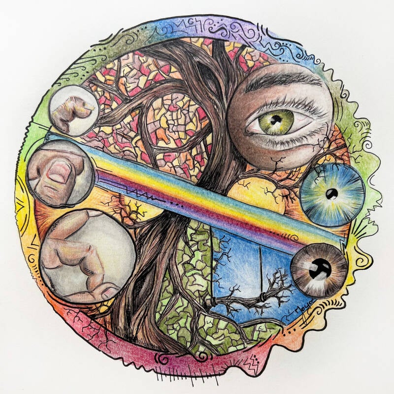 Tekening, a4, kleurpotloden, gelpennen, passer.