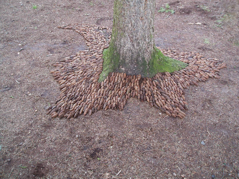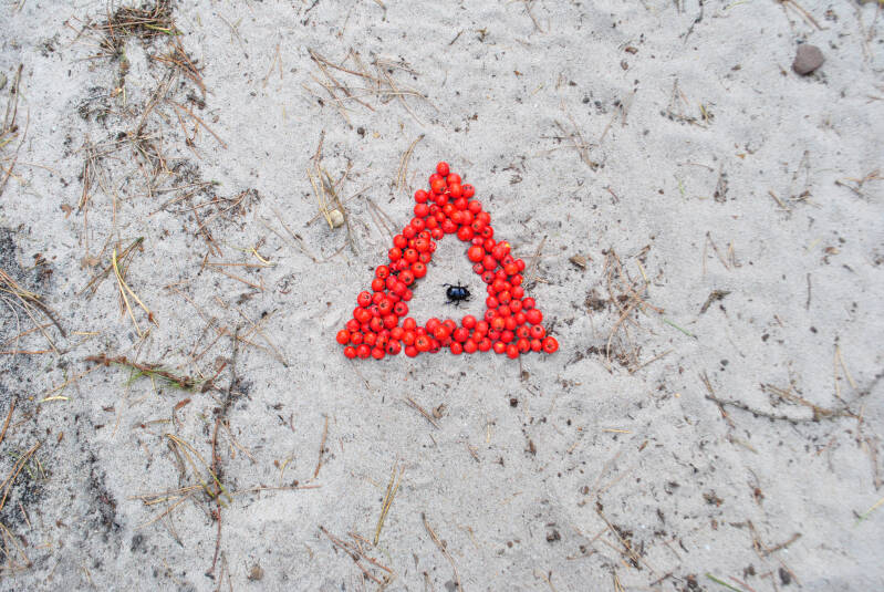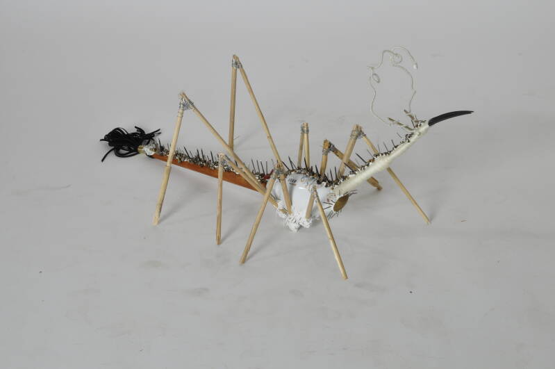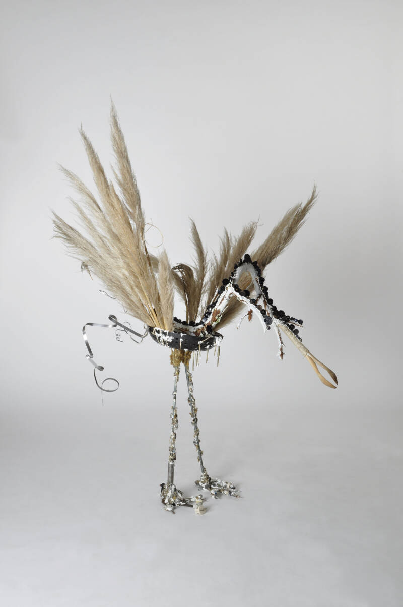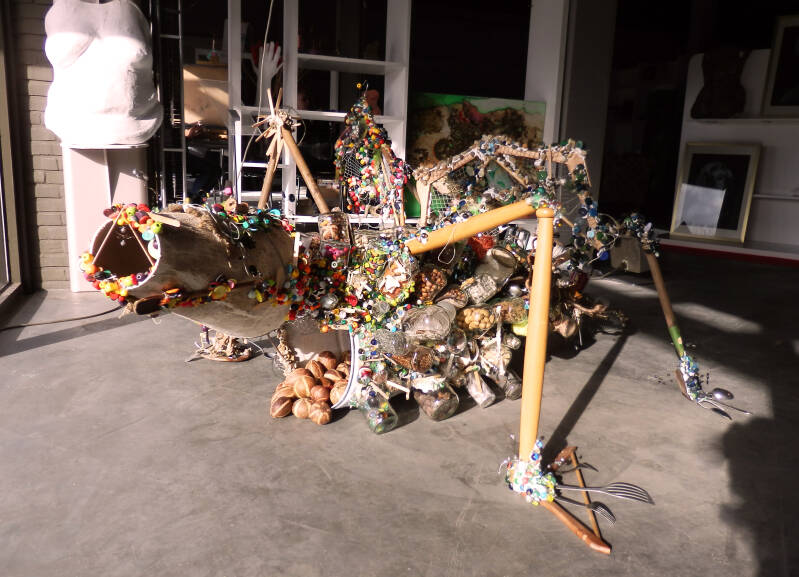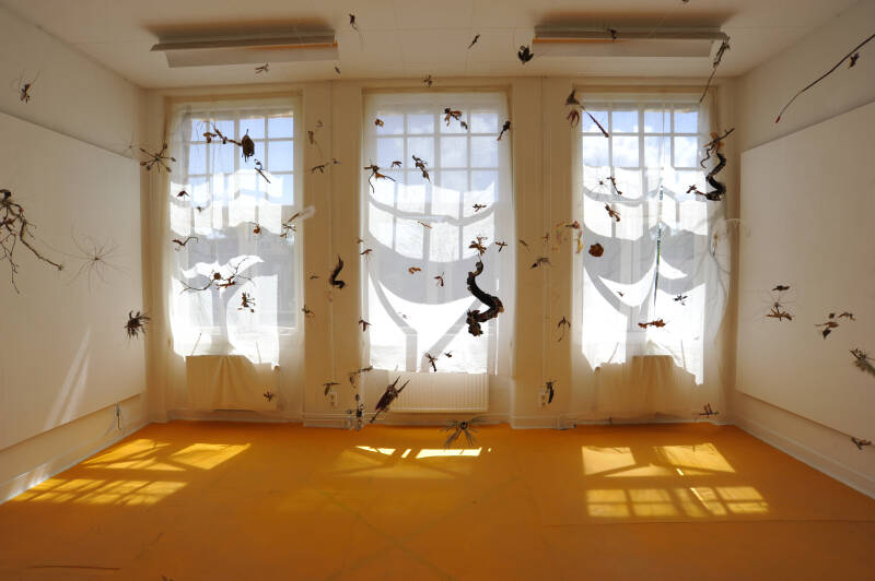 Installatie, video, zwevende mand, blad, stenen in kleuren, allerlei beesten en wezens van natuurlijke en gevonden materialen. 2012